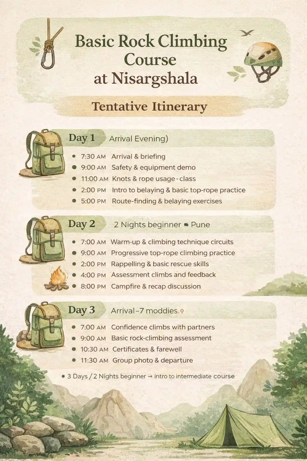 Set amidst natural rock faces and forests near Pune, the course blends technical learning with nature-based living, helping participants grow beyond the wall.