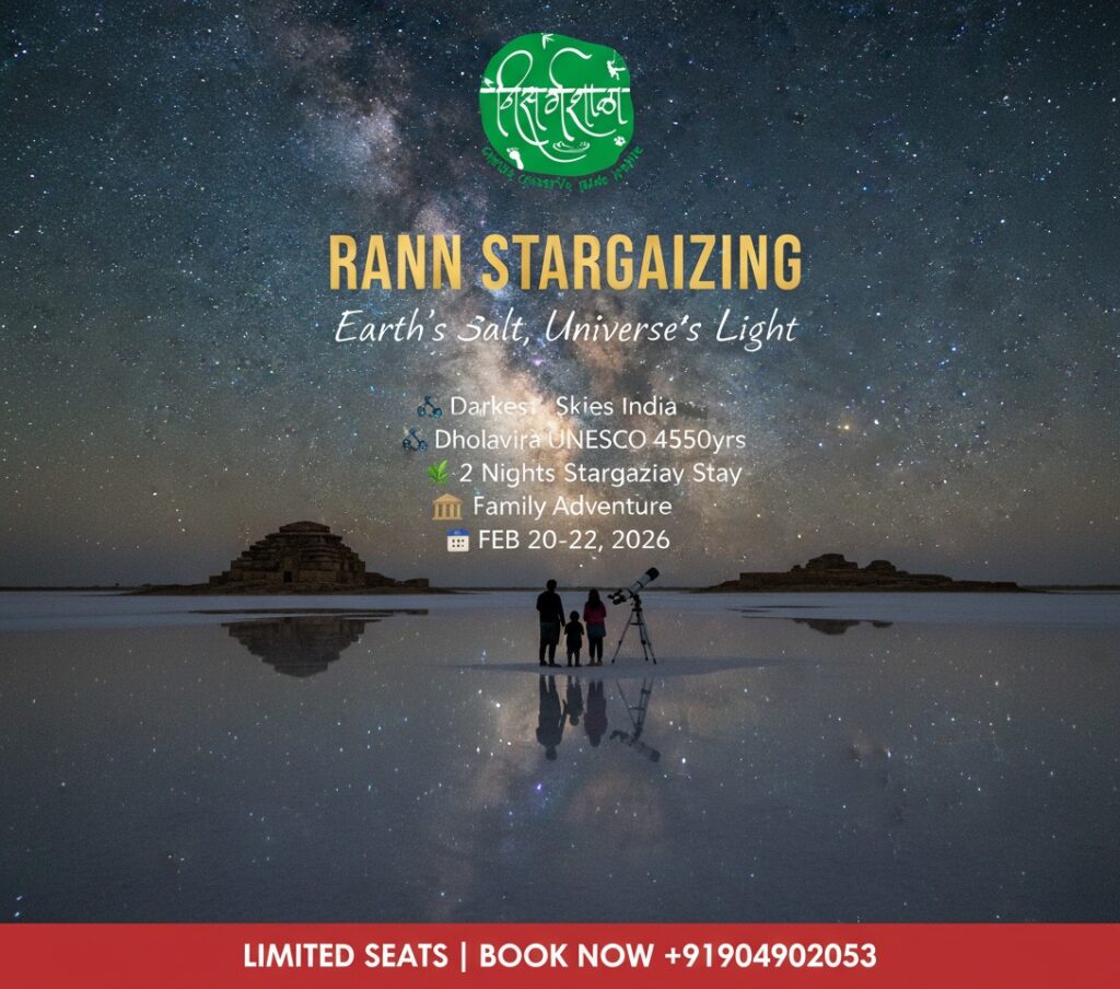 The Nisargshala Rann of Kutch tour is a 2-night/3-day immersive experience that transforms the world’s largest salt desert into a classroom for astronomy, ecology, and indigenous knowledge systems. By staying in traditional eco-homestays, families become part of living communities while observing the night sky from one of Earth’s darkest, most visually distinctive locations. The white salt flats act as natural mirrors, reflecting stars and the Milky Way—a phenomenon unavailable at any other stargazing destination in India.