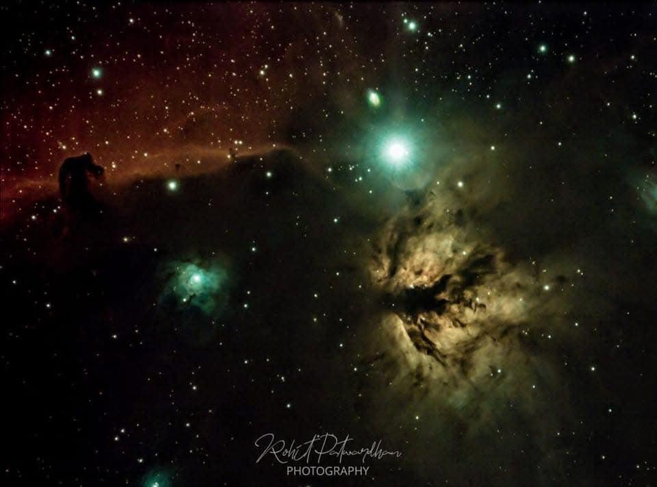 तेजोमेघांच्या विश्वात @ निसर्गशाळा नेब्युला ला मराठीत तेजोमेघ म्हणता येईल. हा विविध रंगी, प्रकाशमान असा की तेजाचे वलय डोळ्यांचे पारणे फेडते. म्हणजे तेज असतेच पण तें मेघामुळे म्हणजे ढगामुळे अधिकच सुंदर दिसते. तेजोमेघांमध्ये असणारे हे मेघ आपल्या ढगासारखे नसतात. आपले ढग पाण्याचे असतात तर हे ढग ब्रह्मांडतील विविध वायु व धुळीचे असतात. सोबतच्या फोटोत दोन तेजोमेघ दिसताहेत, पहिला अगदी घोड्याच्या तोंडासारखाच दिसतोय त्याला नाव देखील तेच आहे, Horse Head Nebula. तेजोमेघांच्या वरील ठोकळ वर्णनाला हा नेब्युला अपवाद आहे. यात मेघ आहे पण तेज अर्थात प्रकाश नाही. म्हणूनच मी यास तमोमेघ असा शब्द नाव वापरु इच्छितो . तेजस्वी नसला तरीही हा दिसतो कारण हा नेब्युला अंतरीक्षातील आणखी एका खुप मोठ्या तेजोमेघामध्ये आहे. हा मोठा तेजोमेघ(Bernard's loop) या फोटोत दिसत नसला तरी त्याची प्रभा दिसतेय horse head च्या मागे. Horse Head हा डार्क आहे. त्याचा डार्कनेस फोटोत स्पष्ट दिसतोय. दुसरा आहे Flame तेजोमेघ. हा एखाद्या मशालीतुन बाहेर पडत असलेल्या ज्वालेसारखा दिसतो. या फोटोत दोन निळसर तारे देखील दिसताहेत. यातील मोठा जो आहे तो मृग नक्षत्रातील, व्याधाने मारलेल्या बाणातील शेवटचा चा तारा आहे. उघड्या डोळ्यांना हे तेजोमेघ दिसत नाहीत. हे पाहण्यासाठी फोटोग्राफी तंत्रज्ञानाचा वापर करावा लागतो. हा फोटो काढला आहे हौशी अस्ट्रो फोटोग्राफर रोहित पटवर्धन यांनी, निसर्गशाळा येथून दि ५ फेब्रुवारी २०२२ च्या रात्री. हा फोटो काढण्यासाठी सव्वा तास कॅमेरा सुरु ठेवावा लागला. फोटोग्राफितील या प्रकारास astrophotography म्हणतात.