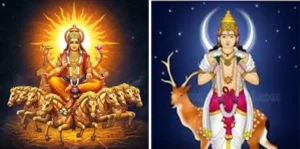 Their story emerges from the great churning of the cosmic ocean — “Samudra Manthan.” When gods (Devas) and anti-gods (Asuras) churned the ocean to obtain amrita, the nectar of immortality, an Asura named Svarbhanu disguised himself and sat among the gods to drink the nectar. Just as the elixir touched his lips, Surya Sun and Chandra the Moon complained to Vishnu.