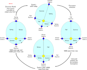 Because of precession, the timing of seasons slowly shifts relative to Earth’s position around the Sun.
