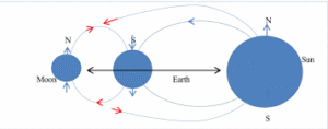Because Earth is spinning, this torque does not cause the axis to fall over; instead, it produces precession. The Moon and the Sun exert their respective gravitational forces upon the Earth. Moon’s effect is about 67%, andthe Sun’s effect 33%